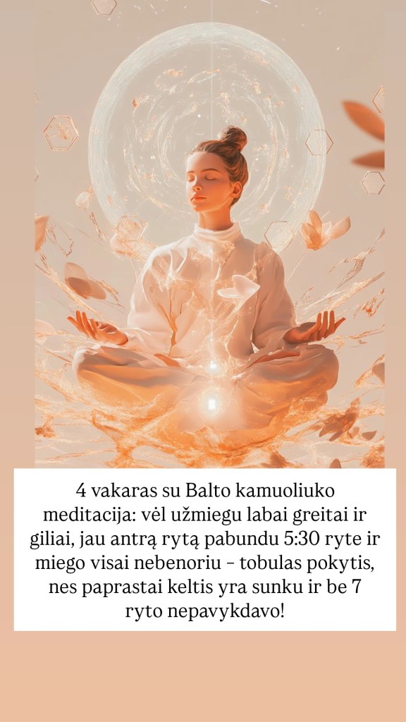 „Balto kamuoliuko“ meditacija man yra pats geriausias miego receptas. Vos įsijungiu, maždaug po 5 minučių aš iškart užmiegu, kažkoks stebuklas! Toliau lieka įrašas įjungtas ir mano pasąmonė miegodama dar klausosi meditacijos iki galo. O pabusti kaip būna lengva, neįtikėtina, nes paprastai man keltis labai sunku su žadintuvais gal trim ar keturiais… Paklausiusi prieš miegą būtent „Balto kamuoliuko“ meditacijos, atsikeliu kartais visa valanda anksčiau nei suskamba žadintuvas, pati natūraliai be pastangų ir dar turiu ryte laiko sau. Super meditacija!